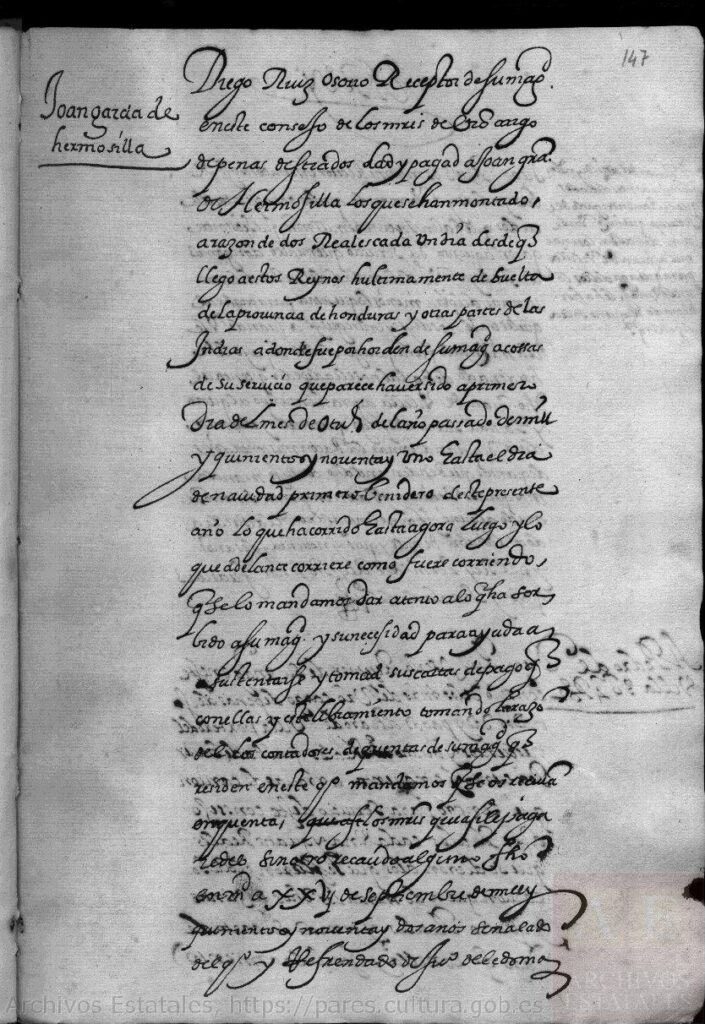 Documento 1 (1592) Consejo de Indias. (1592, 22 de septiembre). Libramiento a favor de Joan García de Hermosilla por servicios en la provincia de Honduras [Expediente administrativo]. Archivo General de Indias, Sevilla, España (Ref. INDIFERENTE, 426, L. 28, F. 147R – 147V). Portal de Archivos Españoles (PARES). https://pares.mcu.es/ParesBusquedas20/catalogo/show/263911